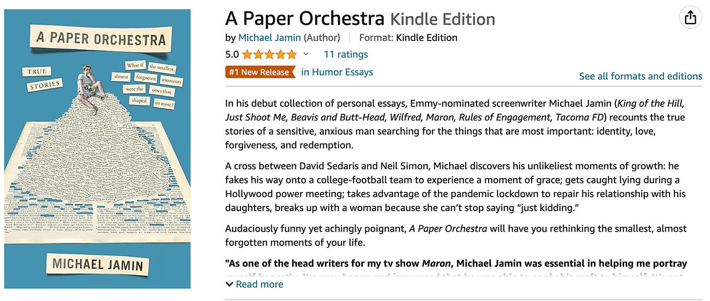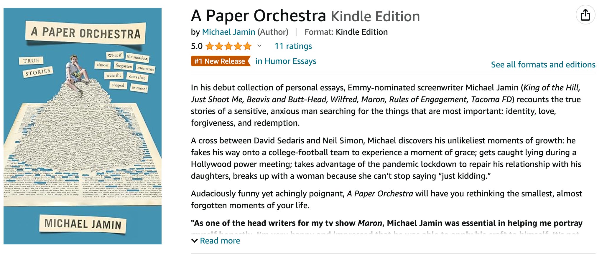 A Paper Orchestra debuted at number one in six Amazon bestseller categories including: Humor Essays, Memoirs of Authors, and Parent and Child Relationships.